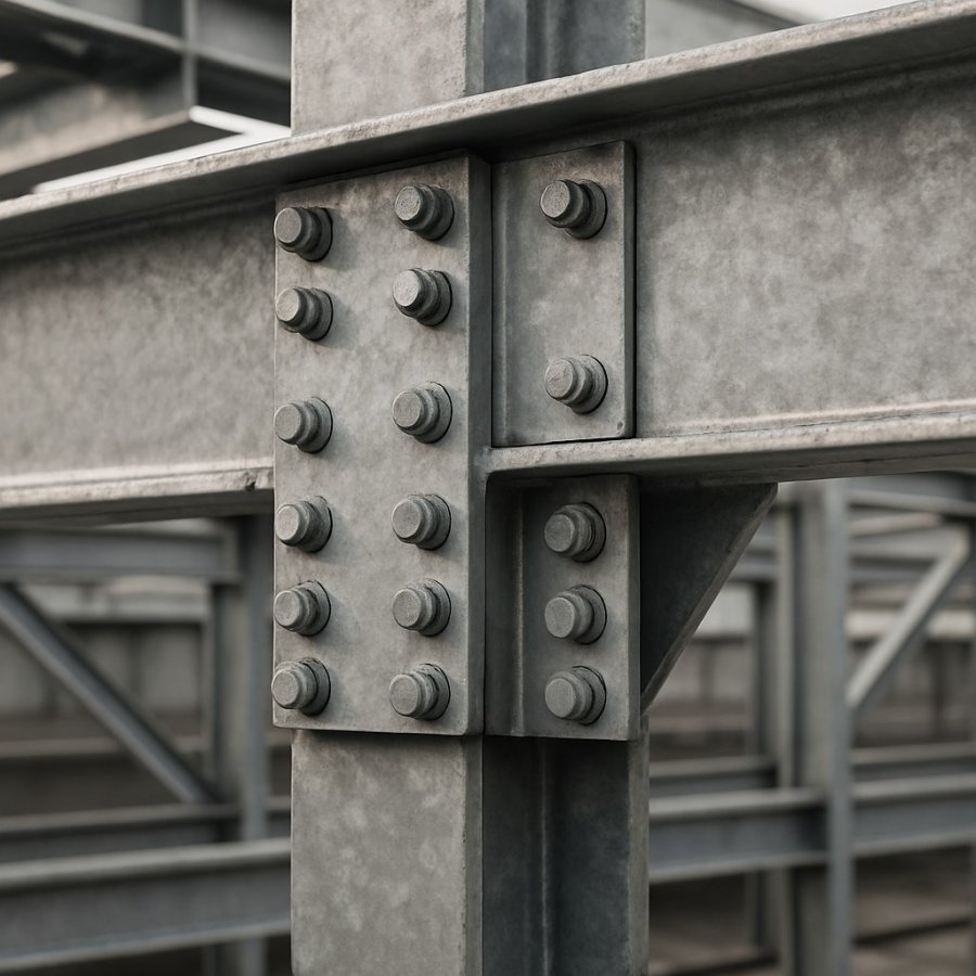 Элементы конструкции (балки, колонны) соединяются с помощью заранее приваренных или приклепанных монтажных пластин (фасонок), которые стягиваются высокопрочными болтами.